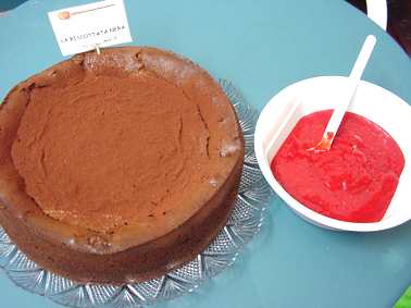 base: 250 gr biscotti secchi al cioccolato, 100 gr burro; ripieno: 750 gr mascarpone, 4 uova, 50 gr farina, 30 gr cacao amaro + quello per spolverare il dolce, 120 gr zucchero a velo, 250 gr panna fresca, 220 gr cioccolato fondente, essenza di vaniglia (ho usato la Bourbon di Lorella); salsa di lamponi: 2 vaschette di lamponi, 2 cucchiai abbondanti di zucchero a velo, 2 cucchiai di marsala. Ungere uno stampo a cerniera di 22/25 cm. Nel mixer ridurre in polvere i biscotti,metterli in una terrina, far fondere il burro e quando è tiepido incorporare poco alla volta alla polvere di biscotti fino ad avere un composto ben amalgamato. Stenderlo sullo stampo unto in precedenza livellandolo bene e facendolo salire anche sulle pareti, tenere in frigo a raffreddare. Mettere le uova intere in una terrina, unire lo zucchero e montare a crema con le fruste elettriche. In un recipiente a parte mettere il mascarpone e lavorarlo con un cucchiaio di legno o una spatola per renderlo ancor più cremoso dopodiché unirlo alla crema di uova mescolando accuratamente. Mescolare farina e cacao e aggiungerla al composto facendo scendere il tutto da un colino. Spezzettare il cacao in un pentolino, metterci anche la panna e far fondere completamente il tutto mescolando. Far raffreddare la crema di cioccolata e quindi unirla al composto di formaggio e uova. Unire un cucchiaino di estratto di vaniglia, o, in mancanza una bustina di vanillina. Riprendere dal frigo lo stampo con il fondo di biscotti e versarvi la crema ottenuta in uno strato uniforme. Cuocere in forno già caldo a 180° per circa un'ora. Spegnere il forno e lasciarvi dentro il dolce a raffreddare. Quando è quasi freddo, mettere in frigorifero fino al momento di servire. Al momento di servire preparare anche la salsa mettendo gli ingredienti indicati nel frullatore e frullare. Sformare il dolce, cospargerlo con un velo di cacao e servire con la salsa di lamponi.