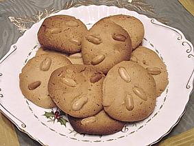 tostare metą delle arachidi in forno a 180° per 2 o 3 minuti, non di pił. Spezzettarle tra le dita. Montare a spuma il burro con i due tipi di zucchero, sbattere l'uovo in una ciotolina ed aggiungerlo poco alla volta al composto. Setacciare assieme farina, lievito e sale ed unire anch'essi, mescolando sempre, poi unire le arachidi tostate. Avvolgere il composto nella pellicola e mettere in frigo per almeno 1 ora. Fare tre parti dell' impasto e con ognuna formare un salsicciotto, che andrą diviso in 10, 11 pezzetti, poi arrotolati a palline. Schiacciare leggermente le palline e porle ben distanti tra loro su due piastre foderate con carta forno. Mettere su ogni biscotto tre delle restanti arachidi. Infornare a 180° per circa 15 minuti, devono dorasi bene. Raffreddare sulla gratella.