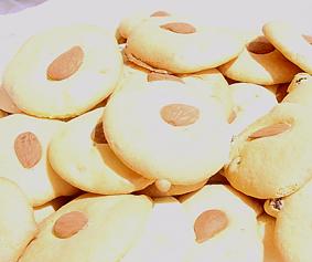 Montare le uova con lo zucchero finchè non diventano quasi bianche e belle gonfie. Aggiungere, mescolando delicatamente, la farina setacciata con la fecola e il lievito e l'uvetta fatta rinvenire in un po' di acqua tiepida. Aiutandosi con un cucchiaio mettere l'impasto su una teglia rivestita con carta forno. Decorare ogni biscotto con una mandorla intera. Infornare a 180° fino a quando i biscotti prendono colore (circa 15 minuti).