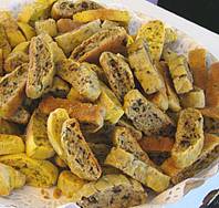 100g di pinoli 250g di farina 1 cucchiaino di lievito 1 cucchiaino di sale 1/2 cucchiaino di pepe nero 1 cucchiaio di semi di finocchio (non l’ho messo) 2 cucchiai di parmigiano grattugiato 100g di olive verdi snocciolate e tritate 3 uova scaldare il forno a 180° e spargere i pinoli in un solo strato sulla placca del frono. tostarli per circa 7 minuti finché croccanti e dorati. fare raffreddare.setacciare la farina con il lievito e il sale in una terrina. aggiungere il pepe, i semi di finocchio, il parmigiano, le olive e le uova e mescolare con una forchetta, poi proseguire a mano. dividere l'impasto in quattro parti formando 4 panetti spessi 2,5 cm e lunghi 30 cm. metterli sulla lastra del forno infarinata e cuocere circa 25 minuti.lasciarli raffreddare appena poi tagliarli a fettine spesse 1 cm e disporle nuovamente sulla teglia.lasciare asciugare in forno per 15 minuti.possono essere preparati anche qualche settimana prima e conservati in contenitori ermetici a temperatura amiente; oppure congelati da crudi per 1 mese.
