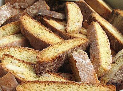 mescolare uova e zucchero. aggiungere il burro fuso, lo zucchero vanigliato, le bucce grattate, il vin santo e gradatamente la farina (salvo un pugno per spolverare le teglie e modellare i bastoncini). aggiungere il lievito e per ultimo la frutta secca. Formare dei biscotti lunghi quanto la teglia e larghi circa 3,5 cm. Adagiare in teglia spolverata di farina lasciando un pò di spazio tra i vari biscotti (un pò rigonfiamo) Cuocere in forno a 200 °C per 15 minuti (dipende dal forno, ma la cottura si vede dal colore che inizia ad imbrunire). Si lasciano raffreddare(altrimenti si rompono), si tagliano a strice spesse circa un dito e si dorano i lati interni ripassandoli in teglia per 3 minuti (1,5 per lato).