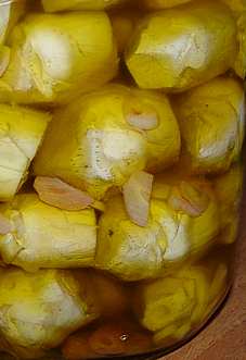 Li pulisco bene bene, togliendo al massimo le foglie dure, poi li scotto per 5 minuti in acqua acidulata (o meglio, in aceto annacquato) con pepe, aglio e sale. Poi li tolgo e li lascio scolare per almeno 12 ore su uno strofinaccio lavato senza detersivo. Li metto poi in un barattolone enorme aggiungendo aglio a fette (anche quello lo scotto leggermente in aceto) e peperoncino. Copro tutto con olio extravergine di oliva e lascio insaporire per almeno un paio di mesi.