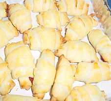 Queste della foto sono frolline con la marmellata di ciliege fatte ritagliando la pasta frolla, ben tirata col mattarello, in tanti triangolini. Si mette un pochino di marmellata e poi si arrotolano dalla base verso la punta.Si spennellano col tuorlo mescolato con un pò di latte. Si cuocciono in forno a 180° per circa 12-15 min. fino che sono colorite.