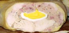 Ingredienti: 1 gallina disossata 2 hg. di petto di pollo 2 hg. di vitello 150 g. di mortadella 150 g. di prosciutto crudo a dadini 3 uova parmigiano 2 uova sode macinare pollo, vitello e mortadella, aggiungere il prosciutto, il parmigiano e le 3 uova intere. Se piace, insaporire con noce moscata e regolare sale e pepe. Iniziare a riempire la gallina, mettendo le uova sode sgusciate al centro del ripieno. Cucire l'apertura della gallina, incrociare le ali sulla schiena e anche le cosce. Fasciare la gallina con un tovagliolo, cucirlo e legarlo. Metterla in una grande pentola con acqua, odori e carne da brodo. Far bollire adagio per due ore. Quando la gallina è cotta, metterla in un piatto, coprirla con un altro e poggiarvi sopra un peso per almeno un giorno.