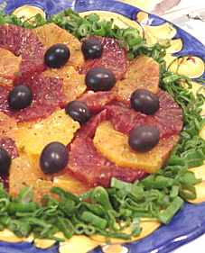 Pelare a vivo 4 arance, tagliarle a rondelle e sistemarle nei piatti individuali su un letto di insalata belga tagliata a listarelle, completare con 2 cipollotti affettati e una manciata di olive nere al forno, condire il tutto con olio, sale pepe e succo d'arancia. |