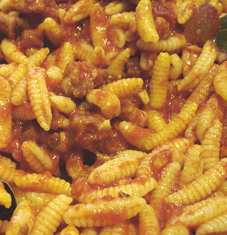 Per 4 persone Ingredienti: 500 gr di semola fine di grano duro, sale, acqua tiepida q.b. Sulla spianatoia mettere la semola salata e fare la fontana. Impastare con poca acqua tiepida, una quantità sufficiente a raccogliere tutta la semola. Is malloreddus devono essere infatti impastati a lungo e la morbidezza della pasta deve essere ottenuta quasi esclusivamente attraverso la lavorazione. La pasta alla fine dovrà essere bianca e ricca di bollicine all'interno, invisibili ma "udibili" perchè mentre si lavora la pasta si devono sentire scoppiare. A questo punto la pasta è pronta, se ne ricavano dei cilindi della grossezza di un grissino e ciascun cilindro si taglia tipo gnocchi di patate. Ciascun tocchetto di pasta si schiaccia poi col pollice, con forza, sopra l'apposito attrezzo di legno o anche sul rovescio di una grattugia. Se la lavorazione della pasta è stata eseguita bene, si otterranno dei riccioli che in Sardegna sono chiamati Malloreddus e che vengono conditi, dopo averli cotti come una normale pasta fresca, col sugo alla salsiccia di cui ho già dato la ricetta. E' anche usanza, per completare il sapore del piatto, impastare una piccola quantità di pasta con un pizzico di zafferano. Si otterranno così pochi malloreddus arancioni, saporitissimi.