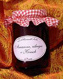 g. 500 di amarene (peso da snocciolate) g. 500 ciliegie nere (peso da snocciolate) g. 700 di zucchero il succo di un limone g. 200 di gelatina di mele verdi g. 30 di kirsch Mettete le ciliegie e le amarene in una casseruola con lo zucchero ed il succo di limone. Lasciate macerare un paio d'ore e poi portate il tutto ad ebollizione. Versate in una ciotola e lasciate riposare (coperto) per una notte intera. Il giorno successivo lasciate colare attraverso un colino il prodotto. Raccogliete il succo in un tegame insieme alla gelatina di mele verdi e fate bollire per 5 minuti, mescolando con cura. Schiumate ed aggiungete le ciliegie e le amarene. Riportate a bollore e fate bollire nuovamente per 5 minuti. Schiumate di nuovo, se ce ne fosse bisogno. Aggiungete il kirsch, versate nei barattoli e chiudete. Fate freddare, etichettate e riponete in luogo fresco e buio.