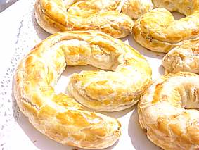 Tostare in forno le mandorle,i pinoli e le nocciole,non le noci.Macinare le mandorle,le noci e le nocciole.Lasciare interi i pinoli.In una terrina versare il succo di arancia e di limone.Aggiungere il burro sciolto,le uvette strizzate,la frutta secca macinata,i pinoli interi,grattugiare la buccia di limone e arancia,il tuorlo,il sale,lo zucchero e il rum.Mescolare bene e assaggiare.Il quantitativo di rum va deciso in questo momento a seconda dei gusti personali.L'impasto va lasciato riposare almeno 24 ore. Stendere la pasta sfoglia formando un lungo rettangolo,tagliarlo in due rettangoli,al centro di ogni pezzo distribuire metà dell'impasto dandogli la forma di un salsicciotto.Ripiegare i bordi di pasta sormontando uno sull'altro.Girare il rotolo in modo che la giuntura stia sotto e arrotolarlo su se stesso,a forma di chiocciola.Spennellarlo con l'altro rosso d'uovo .Cuocerlo in forno a 160° per circa 25-30 minuti.