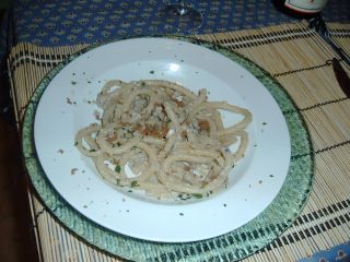 Nel frattempo ho messo a cuocere i pici..li ho lasciati al dente e portati a cottura nella padella insieme alle alici e ad un po' di acqua di cottura. Questo e' il risultato: