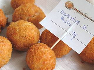 Ho tritato col tritatutto il polpo con poco acqua di cottura, tanto da ottenere una bella poltiglia fine e appiccicaticcia. Ho aggiunto uova, pecorino, sale e pepe e assaggiato per regolare il sapore sapido. Ho passato nel pangrattato non fine e messo in frigo fino al momento di friggere.