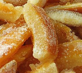 Lavate ed asciugate le arance (di quelle a scorza spessa). Tagliate la scorza a strisce larghe 3mm e lunghe 5cm. Ponetele in una casseruola, copritele di acqua e lasciate sobbollire per un'ora. Aggiungete lo zucchero e il glucosio. Mescolate fino a quando si saranno sciolti. Riportate a bollore. Lasciate raffreddare senza coprire. Il giorno successivo fate ribollire per un paio di minuti, rifreddare. Ripetete il terzo giorno. Se si aggiunge un po' più di zucchero e glucosio si ottiene un'ottima salsina da poter utilizzare sopra i gelati.