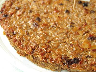 Cuocere il farro in acqua bollente salata per un'ora, scolare e far raffreddare. Unire solo 90 grammi dello zucchero e tutti gli altri ingredienti. Cuocere in forno a 180° per circa 50 minuti in una teglia di 30 cm o per 30-35 minuti in due da 22 cm. Togliere dal forno la torta, cospargerla con lo zucchero rimasto e fare caramellare in forno per altri 10 minuti.