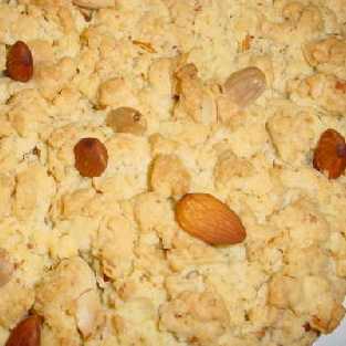 300 g. di farina 1 uovo intero + 1 tuorlo 150 g. di burro fuso 130 g. di zucchero 100 g. di mandorle con buccia 100 g, di mandorle pelate scorza di un limone grattugiata Mescolare tutti gli ingredienti con le mandorle tritate grossolanamente, tenendone qualcuna intera per la guarnizione. Limpasto va lavorato fino che la farina si č assorbita tutta. Mettere il composto in una teglia imburrata e infarinata, sbriciolandolo con le dita, mettendo qua e lā le mandorle intere tenute da parte (io uso la teglia di 28cm) Cuocere a forno caldo a 180 gradi per circa 30 minuti fino a quando sarā ben colorita. Lasciare in forno spento per 5 minuti.