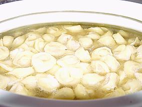 Penso sia corretto, nel rispetto delle tradizioni, che tu abbia anche questa ricetta, definita "l'originale". Io non so, sarà che a me piace tanto fare le cose piccoline, ho sempre fatto tutto da sola, impasto 4 uova alla volta, e, se l'impasto è doc, nè troppo morbido nè troppo duro, non ho problemi (adotto il sistema di coprire con nylon come ti hanno consigliato). Le foto di Babette nei FOTOgrammi sono molto chiare, si noti il "dosaggio del quantitativo" fatto rigorosamente con le mani. sembra una cosa da niente, ma un tortellino vuoto è una schifezza, ve lo ritroverete grinzo e rugoso dopo la cottura, ma se è troppo ciccio si spaccherà di certo. Altra cosa da fare notare è l'utilizzo del tagliapasta "dentellato", nelle campagne tutti fanno così, in città invece mi sono accorta che non lo fa + nessuno, neanche nei negozi delle sfogline si vede. Buttare i tortellini in brodo bollente e appena il bollore riprende spegnere, mettere un coperchio e aspettare qualche minuto, scoperchiare e assaggiare. In questo modo si evita 1) rotture x bolliture turbolente, 2)che il tortellino passi di cottura. Forse non è indispensabile, ma faccio così anche quando uso tortellini aurgelati e mi trovo bene.