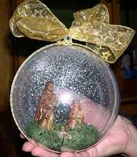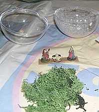 Si incolla il presepio alla metà della palla cu cui si è spruzzata la neve, lasciando debordare un po' di muschio.
