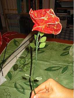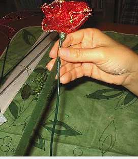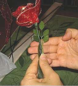 Ricoprite lo stelo della rosa con la carta ed inserite le foglioline.
