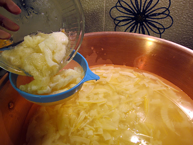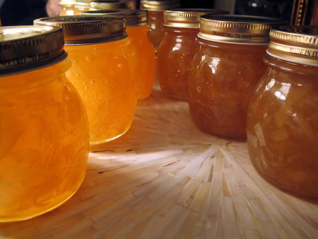 Il mio solito "spacciatore" di agrumi naturali al mercato in Pratogiano ( Francesco Marino con i prodotti coltivati dal padre in Sicilia) sabato scorso aveva dei bei cedri. Vederli e pensarli in marmellata è stato tutt'uno, ma come farla? Sicuramente con il metodo inglese, è quello che preferisco per gli agrumi con semi, e nella fattispecie preferisco quello che ho usato per preparare la " Oxford marmalade" quindi mi metto all'opera. Mi accorgo però, tagliando il primo, che questi cedri hanno pochissimi semi... accidenti... ed ora? Non disperiamoci, si passa all'opzione B: spremo i cedri, tolgo dalle semisfere tutti i residui di pellicine e polpa e li metto a macerare assieme a quei tre semi che ho recuperato spremendoli pensando che anche loro producono pectina. L'ho indovinata! Non avevo mai assaggiato la marmellata di cedri e devo dirvi che è buonissima! Ecco il risultato,