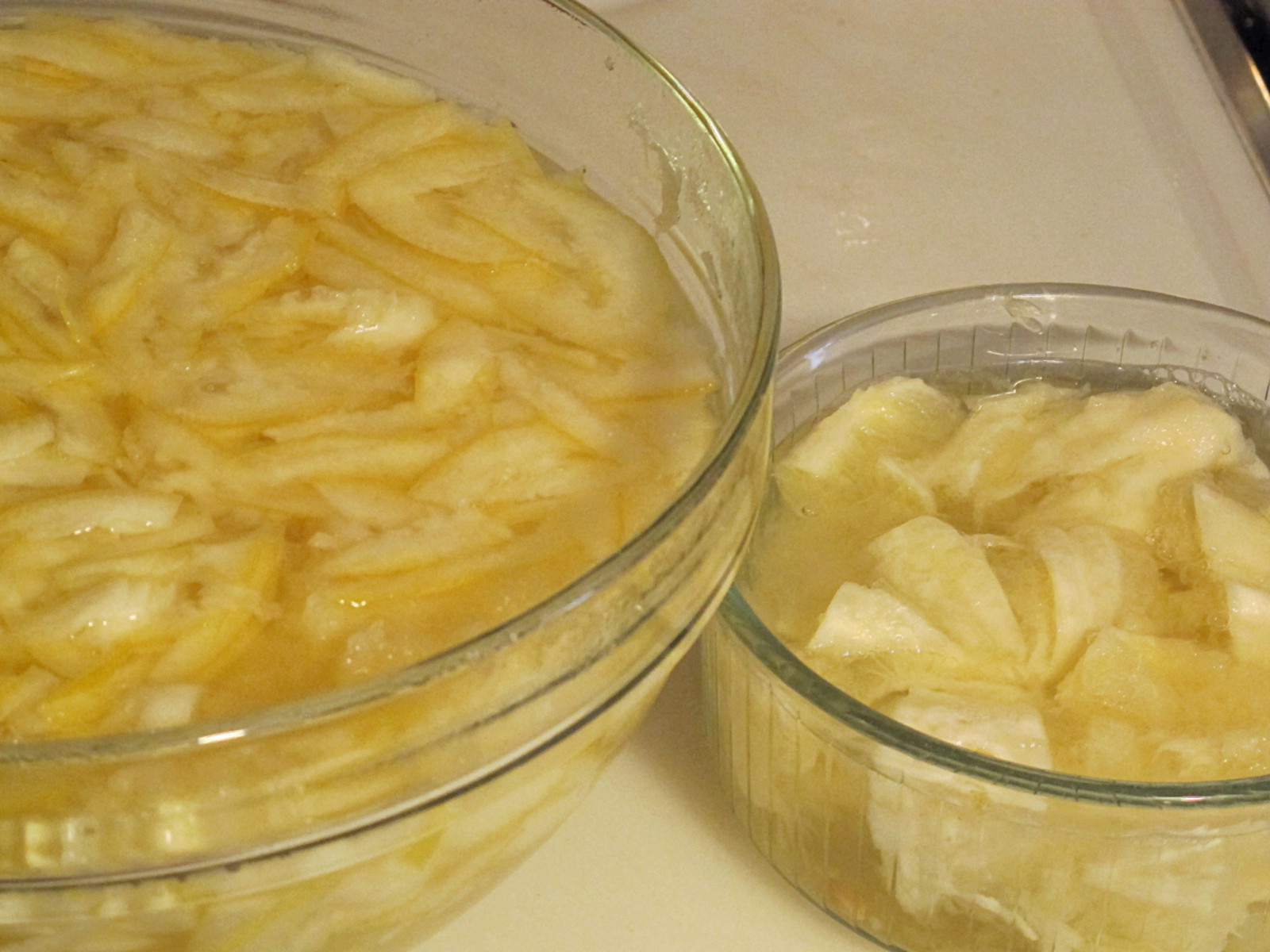 Riunire le strisce di scorza al succo nel capiente contenitore resistente alle alte temperature ed i semi e le pellicine in un contenitore dello stesso tipo, più piccolo.