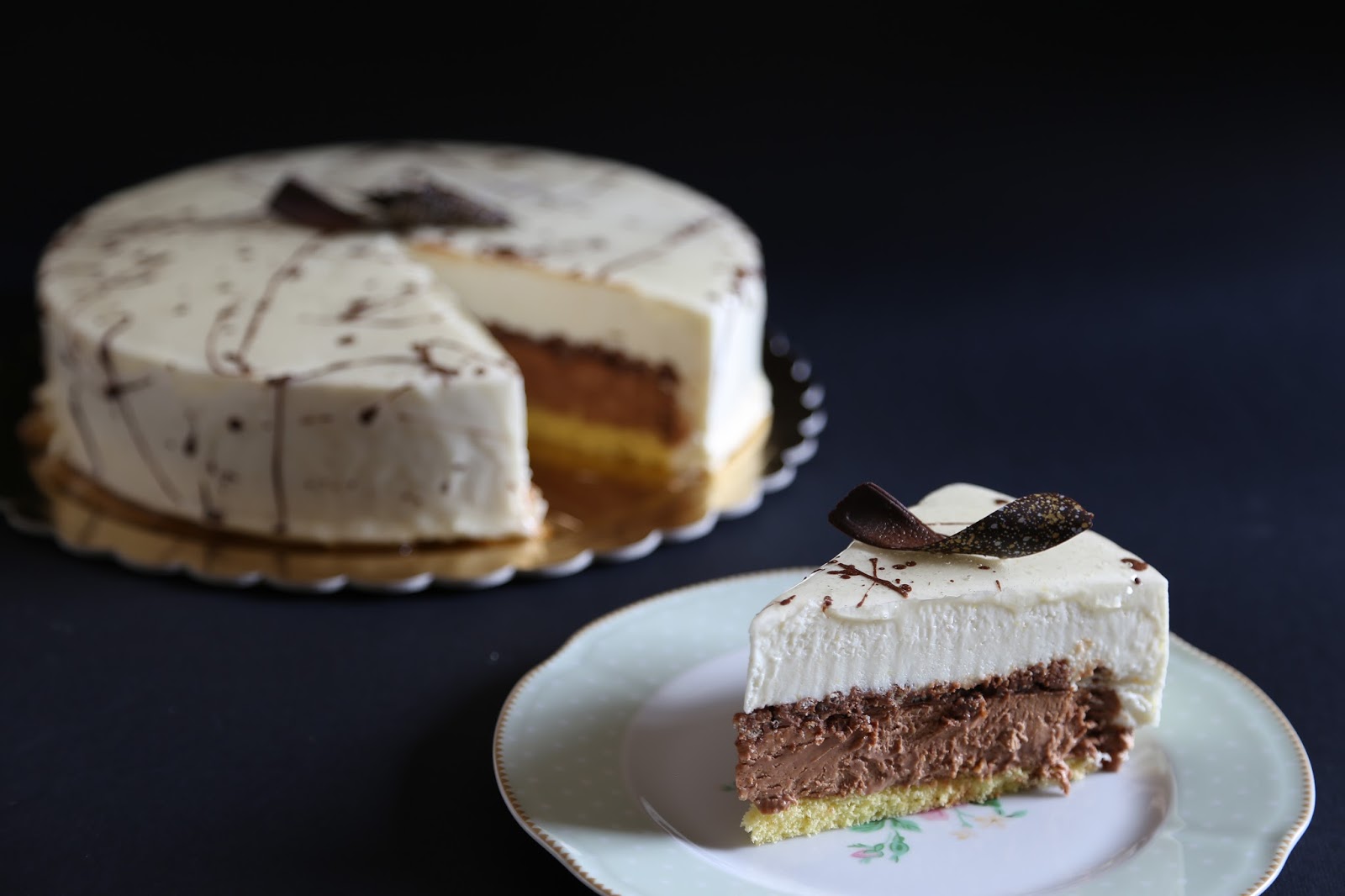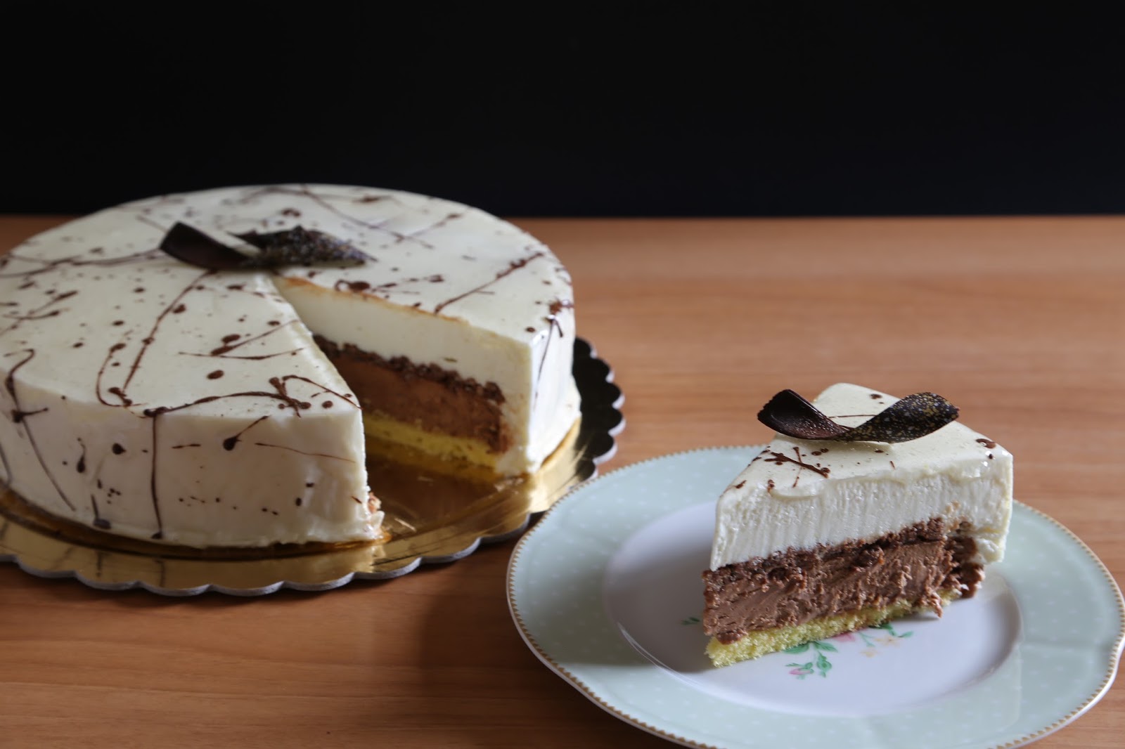 Sciogliere 50 g di cioccolato fondente con 10 g di burro di cacao e con uno spazzolino spruzzarlo sulla superficie del dolce surgelata in modo da creare dei decori.