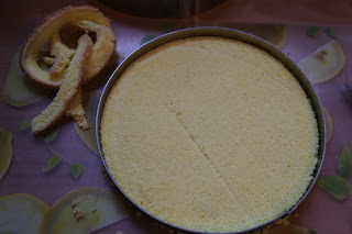 Il montaggio viene effettuato a rovescio. Appoggiare su una teglia un foglio di acetato (oppure foderare con la pellicola la base di una tortiera, come nella foto sopra) e posarvi sopra il cerchio da 24 cm di diametro. Foderare internamente il cerchio con una striscia di acetato.