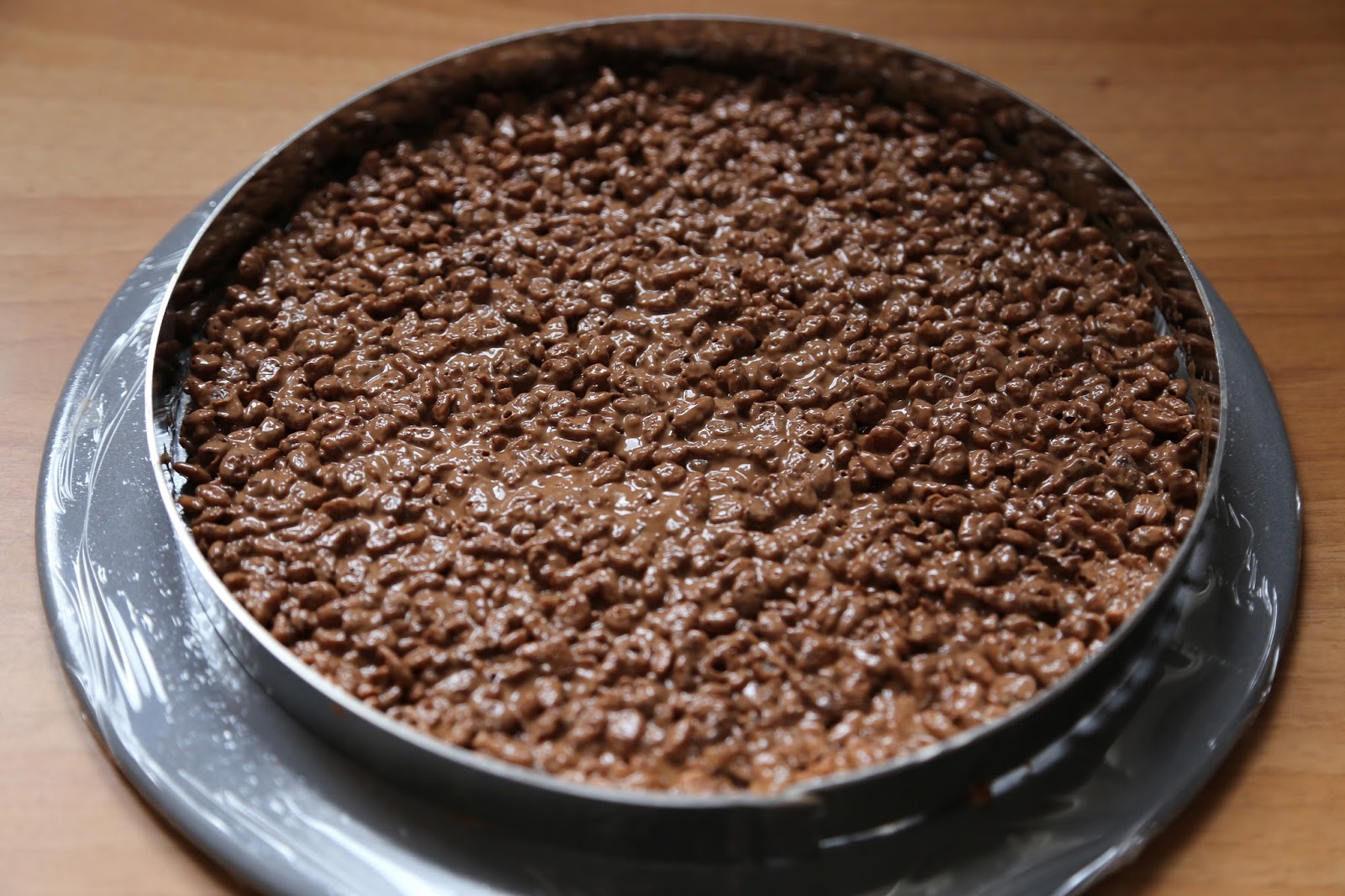 In una casseruola, fondere il cioccolato a bagnomaria. Versare il riso soffiato e mescolare. Stendere uno strato sottilissimo (2-3 mm) all'interno di un cerchio di acciaio di 22 cm di diametro, togliere il cerchio (altrimenti il cioccolato si attacca e quando solidifica si spezza) e lasciare solidificare al fresco.