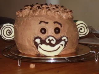Tempo fa avevo chiesto aiuto per realizzare una torta in tridimensionale a forma di testa di scimmia...bè la cosa si è fatta ma la decorazione non mi ha soddisfatto pienamente...si poteva fare di meglio! l'unica attenuate che mi posso dare è che ho lavorato alle decorazioni in una giornata calda e il cioccolato non teneva molto! Comunque ai bambini pare sia piaciuta...ah passo alla descrizione: