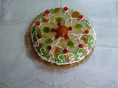 La glassa velata: in un pentolino ho messo 700 gr. di zucchero a velo, mezzo bicchiere di acqua e un cucchiaio di succo di limone ed ho iniziato a mescolare con una frusta a mano. Ho posto il pentolino su un fuoco bassissimo e sempre mescolando ho aggiunto di tanto in tanto pochissima acqua fino a quando lo zucchero si è sciolto diventando quasi trasparente. A questo punto .........ho versato la glassa in un sol colpo sulla cassata che si è velata come per magia! Le decorazioni sono state fatte come per tradizione con la zuccata, con l'arancia, il mandarino e la pera canditi. Ho concluso la decorazione con la ghiaccia reale.