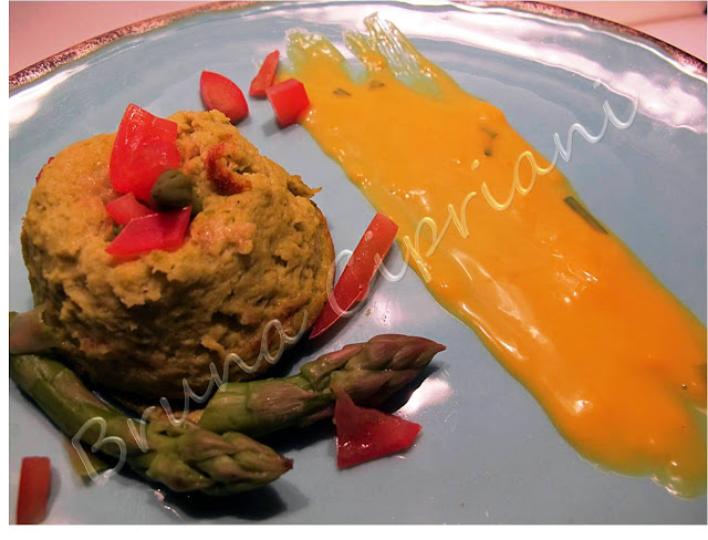 Lavare gli asparagi, pelarli e sbianchirli in acqua bollente acidulata e salata. Conservare le punte per la guarnizione, frullare il resto con il mascarpone, il pecorino, lo scalogno stufato pianissimo in olio extra vergine, le uova e regolare di sapore con sale e pepe. Imburrare degli stampini , riempirli con il composto e cuocere a bagnomaria in forno caldo a 160°C per 35/40 minuti, lasciare riposare circa 3 minuti e sformare.Saltare in padella le punte di asparagi messe da parte in precedenza con olio extra vergine, scalogno, sale e pepe.Stebdere la salsa allo zafferano sui piatti, sistemare al centro lo sformatino e decorare con le punte di asparagi