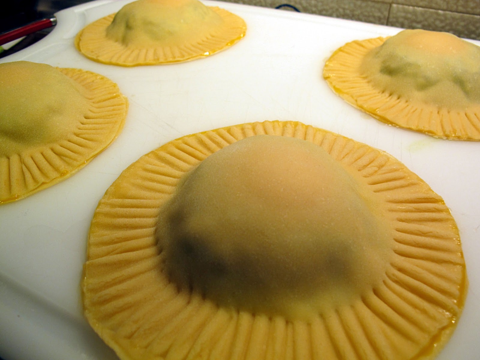 Disporre su 4 dischi un nido d'impasto ricotta e spinaci, riporre al centro il tuorlo e richiudere con l'altro disco di pasta premendo leggermente per rimuovere tutta l'aria. Volendo si possono pennellare i bordi con un tuorlo per sigillare bene scongiurando il rischio rottura ,una volta che le estremità avranno ben aderito, sigillare la pasta premendo con i rebbi della forchetta.