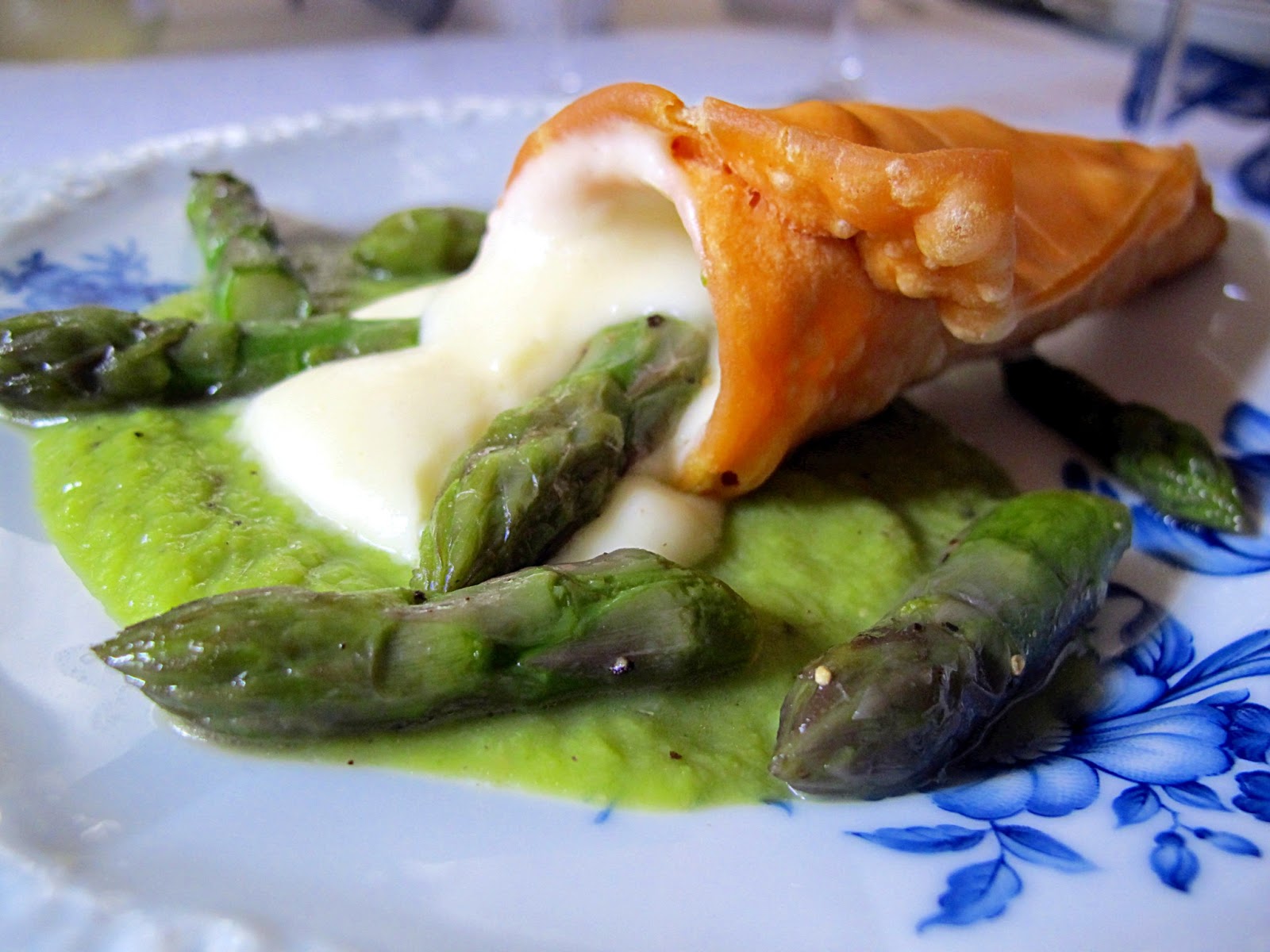 Mettere due cucchiai di crema d'asparagi al centro del piatto, adagiare i cornetti fritti decorando con alcune punte d'asparagi.