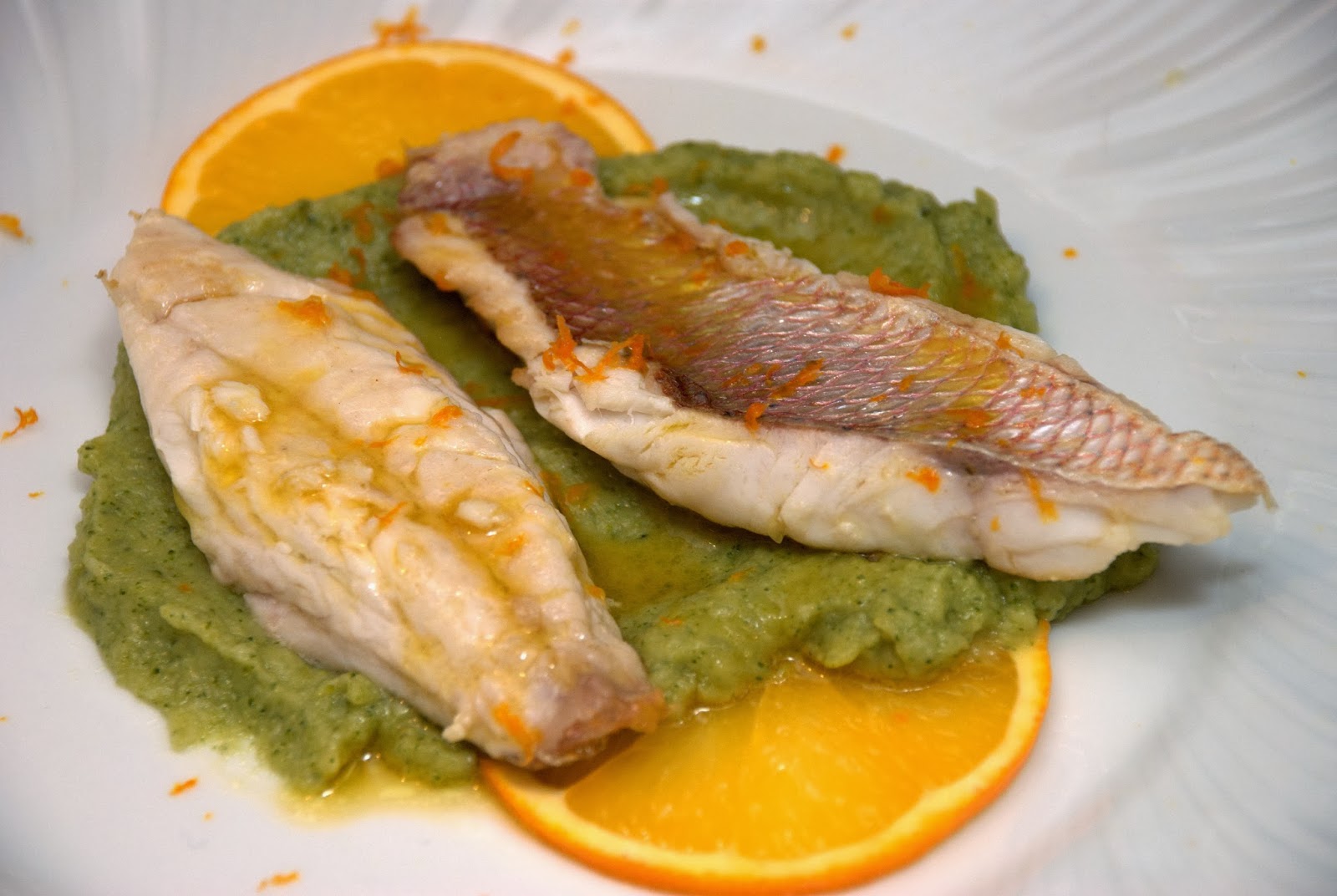 Pagello fragolino all'arancia e crema di broccoli