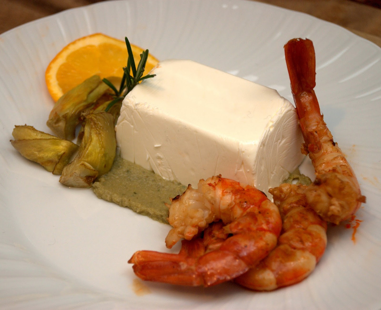 Pannacotta di burrata, carciofi e gamberi all'arancia