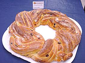 Rimettere nella ciotola unta e lievitare 1 ora finchè sarà raddoppiato. Rovesciarla sul tavolo infarinato e stenderla formando un rettangolo di 2-3mm di spessore, senza lavorarla. Pennellare abbondantemente con il burro fuso, cospargere di uva sultanina, ammollata e asciugata e l’arancia candita. Arrotolare il lato più lungo. Tagliare questo a metà per il lungo con un coltello affilato e sottile, infarinandolo ogni tanto. Separare delicatamente i due pezzi, girarli tenendo il lato tagliato verso di voi e formare una treccia facendo in modo che la parte tagliata rimanga il più possibile all’esterno. Mettere su una teglia da forno e chiudere a ciambella. Pennellare con burro fuso e fare lievitare 30 –40 minuti a campana (deva quasi raddoppiare). Cuocere in forno 200° per 20 25 minuti . Nel frattempo diluire i 4 cucchiai di zucchero a velo con chiara d’uovo fino ad avere una glassa semidensa. Dopo la cottura spennellare e rimettere in forno per 30 secondi.