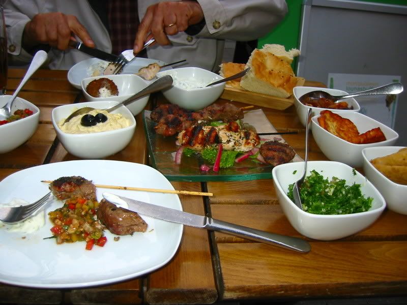 ecco, l'ultima sera che abbiamo passato ad Helsinki, siamo tornati a mangiare in un ristorante turco che ci era piaciuto tantissimo (ci siamo andati un sacco di altre volte) ed abbiamo mangiato questo piatto che - scusate - non ricordo più come si chiamava, ricordo solo che mi era piaciuto tantissimo!!!!!! Mi dispiace solo che mi sono ricordata di fare la foto.... in corso ormai d'opera quindi molte concoline erano già sparite. Praticamente erano spiedini di carne e polpettine speziate e una decina di concoline con vari sfizi!!!
